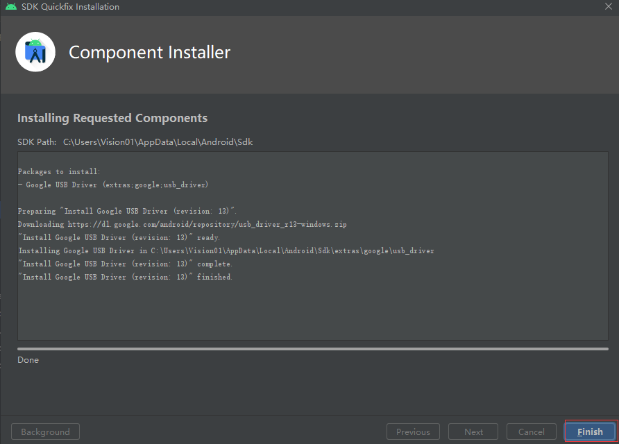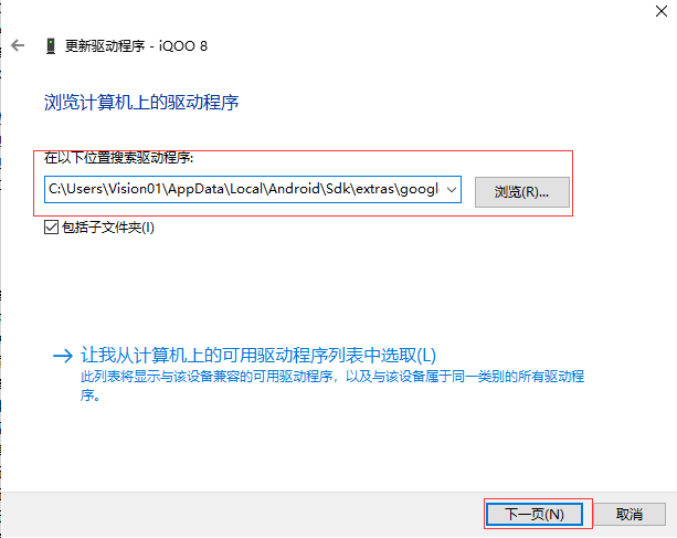 路径一般是C:\Users\Vision01\AppData\Local\Android\Sdk\extras\google\usb_driver(其中Vision01指的是我的用户名)