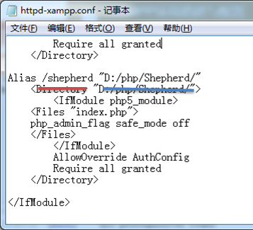 在文件底部,新增如下整段配置项,其中红线部分为虚拟路径,蓝线部分为指向的物理路径,浏览器访问地址localhost:81\shepherd