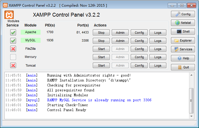 这个界面设计容易产生误解,最左侧的Service列表中,表示该服务已被注册为系统服务,可以开机自启动,并不表示服务已启动表示该服务不是系统服务,不会开机自启动,并不表示服务未启动;服务的运行状态要看“Actions”中是start,还是stop。