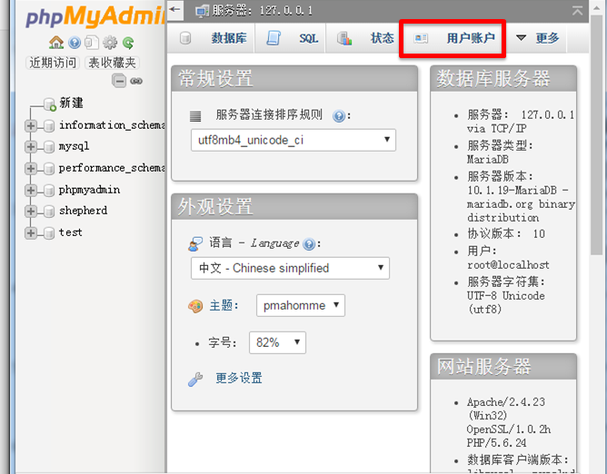 点击右上角的“phpMyAdmin”,进入数据库管理页面