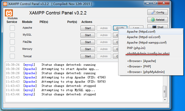 打开xampp,修改config.inc.php中的数据库密码(['password'] = '你的密码')